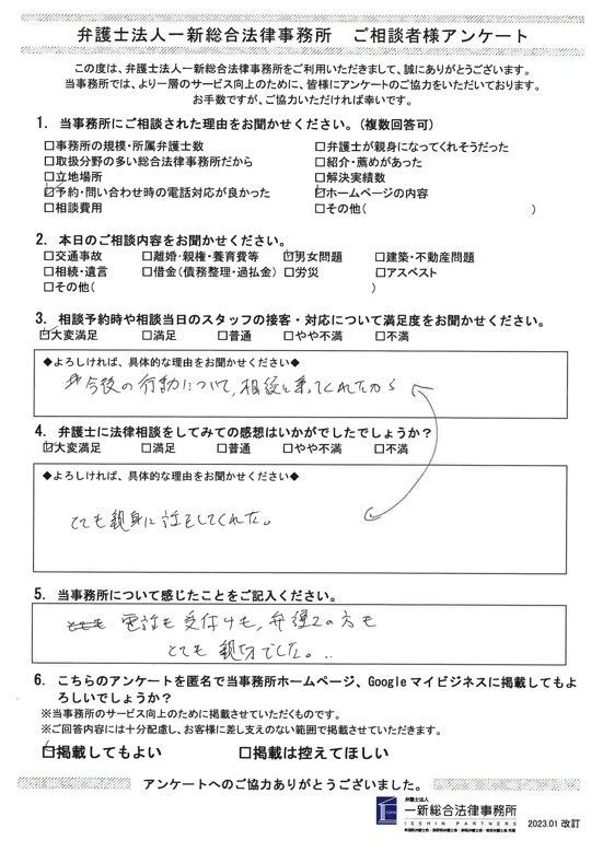 「離婚」「男女問題」「親権」「養育費等」「男女問題」「面会交流」「財産分与」「慰謝料」などについてお悩みの方、弁護士をお探しのみなさまは、一新総合法律事務所までどうぞお気軽にお問い合わせください。
