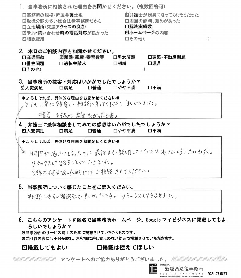 新潟の弁護士による離婚・慰謝料の相談 > お客様の声 > ご相談者 > 時間が過ぎてしまったのに最後まで説明してくださりありがとうございました。(離婚・親権・養育費のご相談) > c0f76fd8a0b95747ae50c58f6b6b6314