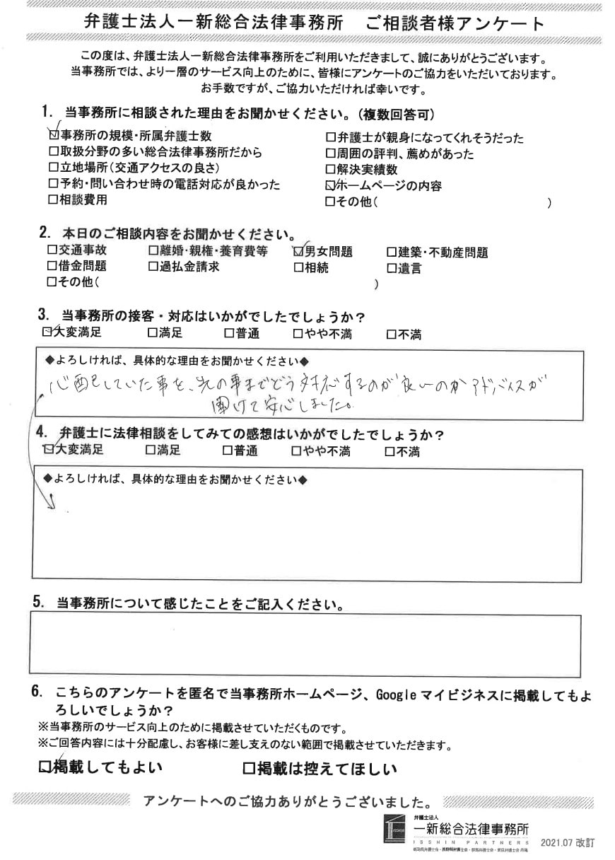 新潟の弁護士による離婚・慰謝料の相談 > お客様の声 > ご相談者 > 「心配していた事を、先の事までどう対応するのが良いのかアドバイスが聞けて安心しました。」 > niigata-rikon2-min-1