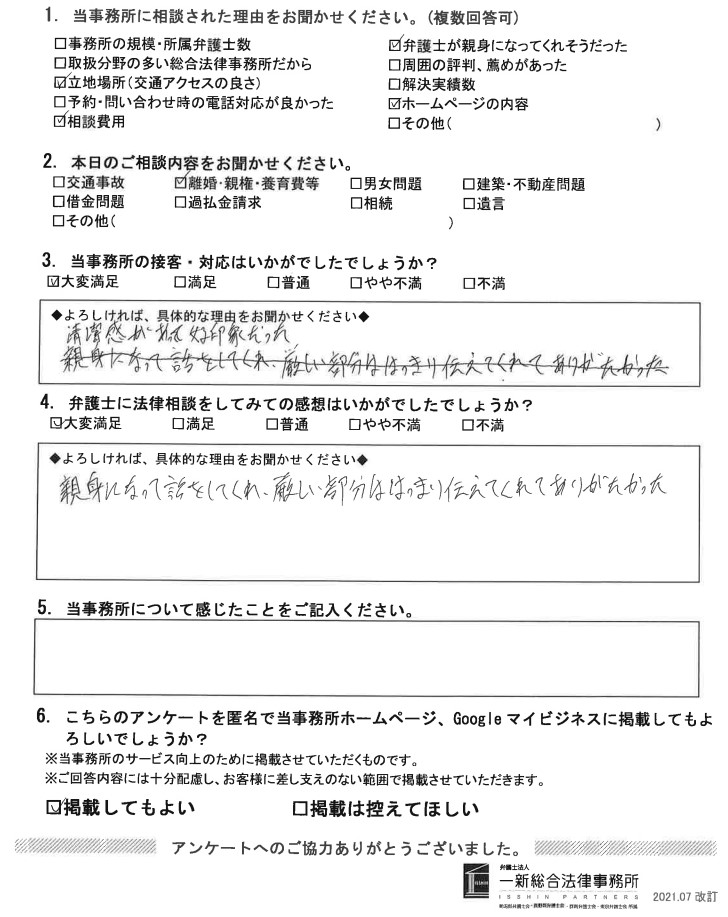 新潟の弁護士による離婚・慰謝料の相談 > お知らせ > 「親身になって話をしてくれ、厳しい部分ははっきり伝えてくれてありがたかった。」 > jyouetu-rikon