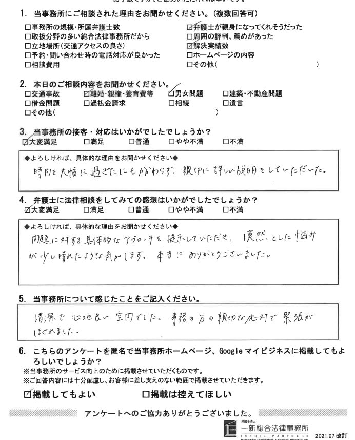 新潟の弁護士による離婚・慰謝料の相談 > お客様の声 > ご相談者 > 「問題に対する具体的なアプローチを提示していただき、漠然とした悩みが少し晴れたような気がします。」 > niigata-rikon-min-2