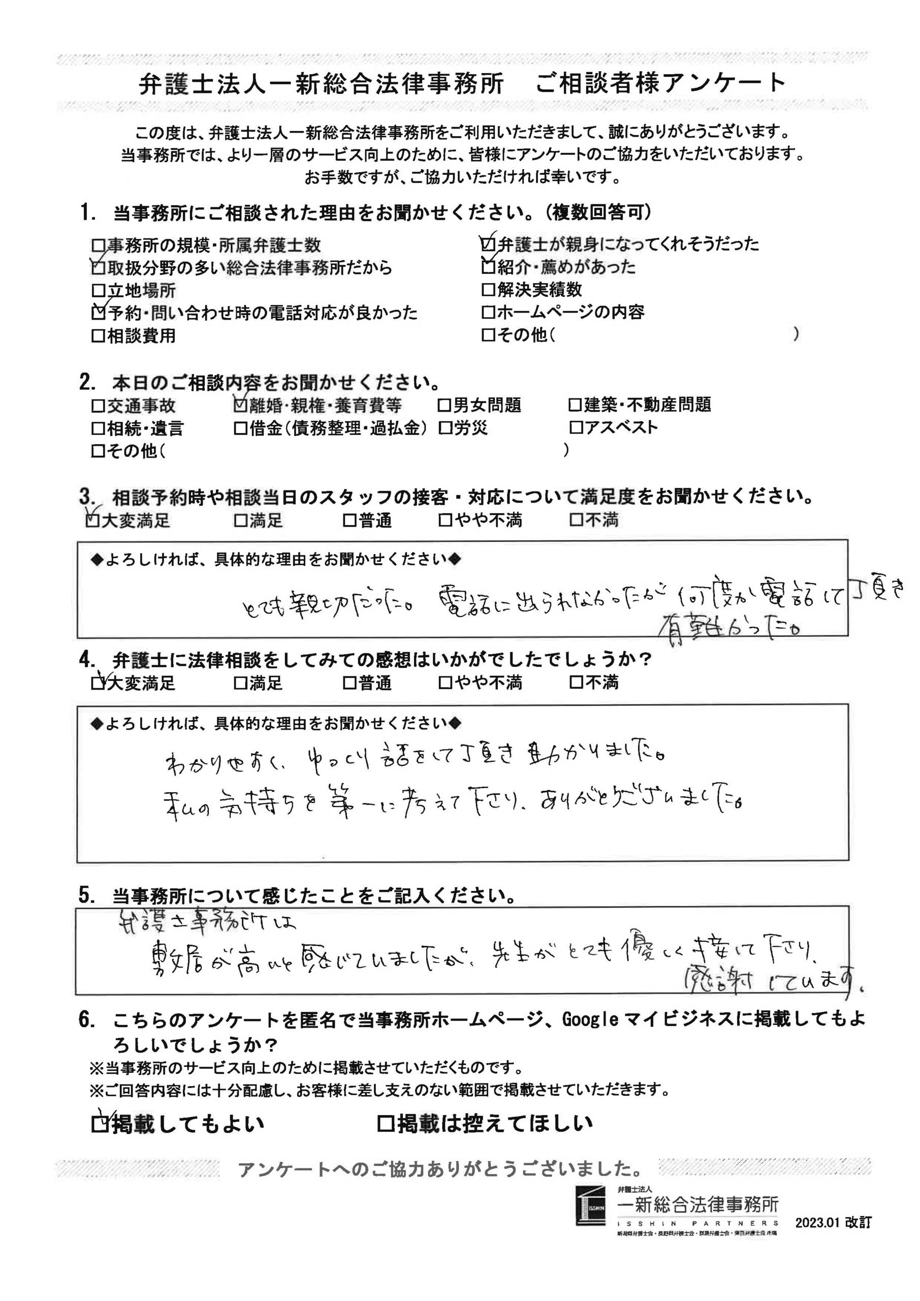 弁護士事務所は敷居が高いと感じていましたが、先生がとても優しく接して下さり感謝しています。