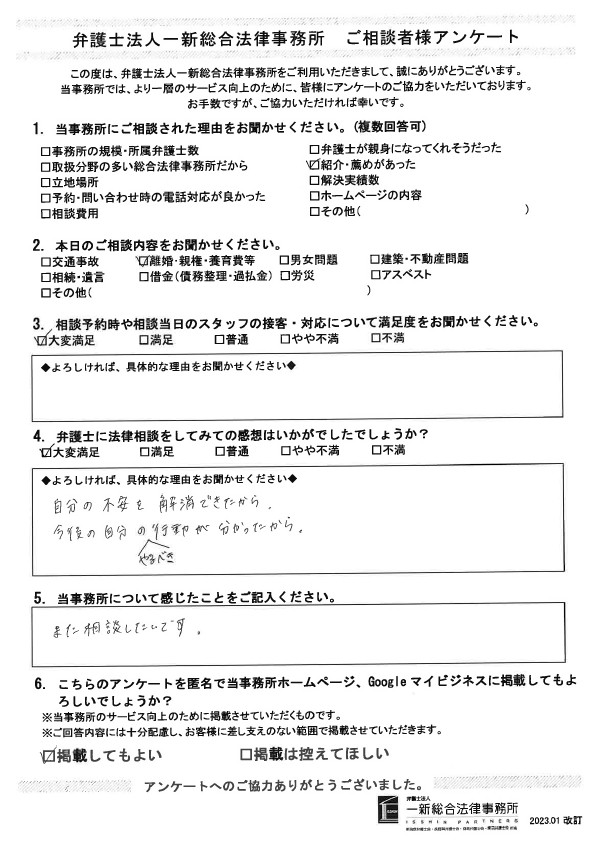 離婚・親権・養育費等について長岡事務所でご相談されたお客様の声をご紹介します
