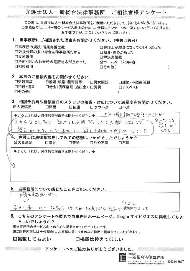 弁護士事務所という所に初めて来たので緊張しましたが、物腰柔らかな対応で安心しました。